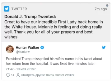 Американський президент Дональд Трамп в написанні імені своєї дружини допустив образливу помилку. Відомо, що американський лідер у своєму Twitter розповів про те, що його дружина Меланія Трамп була виписана з лікарні.