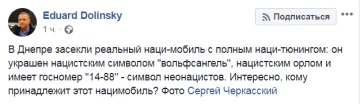 "В Днепре засекли настоящий наци-мобиль с полным наци-тюнингом: он украшен нацистским символом "Вольфсангель" нацистским орлом и имеет госномер "14-88"- символ неонацистов. Интересно, кому принадлежит этот націмобіль?" - задается вопросом автор поста.