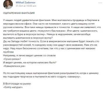 "У наших людей удивительная фантазия. Мне жаловались продавцы в Берлине в мерседесовском офисе. Они часто не понимают, какого цвета машину хотят русские клиенты. Все-таки немцы привыкли к точности. А наши им заявляют, что им требуется машина цвета "пожухлого баклажана" или цвета "шампанского, вылитого в бурю в морскую волну". Немцы в недоумении, зачем вообще выливать шампанское в морскую волну?"