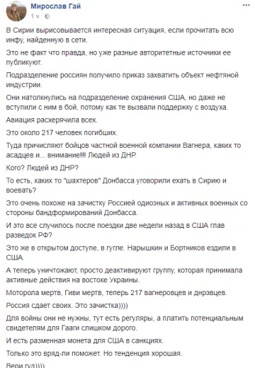 В Сирии погибли не только наемники российской частной военной компании "Вагнер", но и террористы "Донецкой народной республики", что может свидетельствовать о зачистке Россией одиозных и активных военных со стороны бандформирований Донбасса. Это заявил руководитель благотворительного фонда "Mir & Co" Мирослав Гай в Facebook.