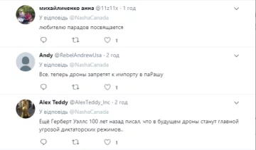 "Еще Герберт Уэллс 100 лет назад писал, что в будущем дроны станут главной угрозой диктаторских режимов...", "Возможно и людей передавили убегая", "Любителю парадов посвящается", "Все, теперь дроны запретят к импорту в парашу", - пишут они.
