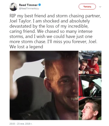 "Він не гнався за славою, він гнався за штормом, тому що це була його пристрасть. Останніми роками він збирався з батьком полювати на шторм навіть не беручи із собою камеру. У нас болять серця за його батька, матір, братів, сестер та їхніх дітей. Знайте, ми молимось за вас. Спочивай з миром, Джоел".