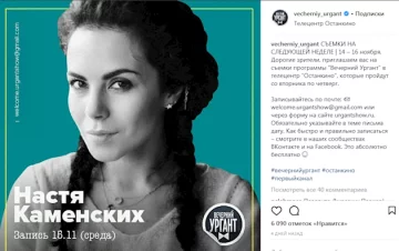 "Дорогі глядачі, запрошуємо вас на зйомки програми "Вечірній Ургант" до телецентру "Останкіно", які пройдуть з вівторка по четвер", – сказано в повідомленні, обличчям якого стала українська зірка. Судячи з запису на постері, Каменських буде брати участь в записі 15 листопада.