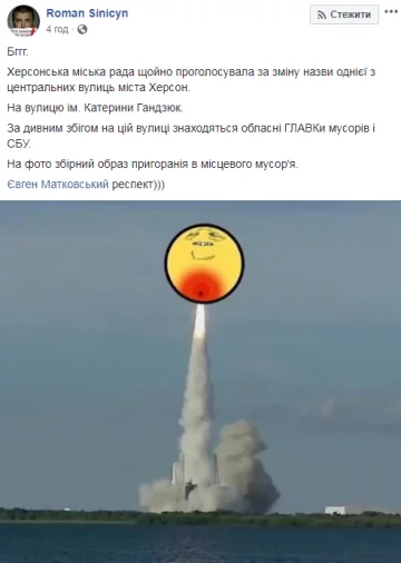 "Херсонська міська рада тільки проголосувала за зміну назви однієї з центральних вулиць міста Херсон на вулицю імені Катерини Гандзюк. За дивним збігом на цій вулиці знаходяться обласні ГЛАВКи м*сорів і СБУ. На фото збірний образ підгоряння у місцевого м*сорья", - прокоментував активіст Роман Синіцин.