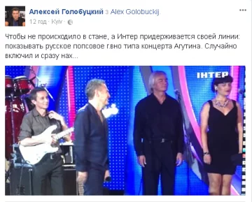 "Що б не відбувалося в країні, а "Інтер" дотримується своєї лінії: показувати російське попсове л**но типу концерту Агутіна. Випадково включив та відразу н*х..." - написав він.